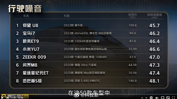 而在行驶噪音测试中,小米YU7同样表现亮眼:前排噪音值46.6dBA,位列榜单第4,仅次于仰望U8(45.7dBA)、宝马i7(46.2dBA)、蔚来ET9(46.4dBA),超越迈巴赫S级等豪华车型。